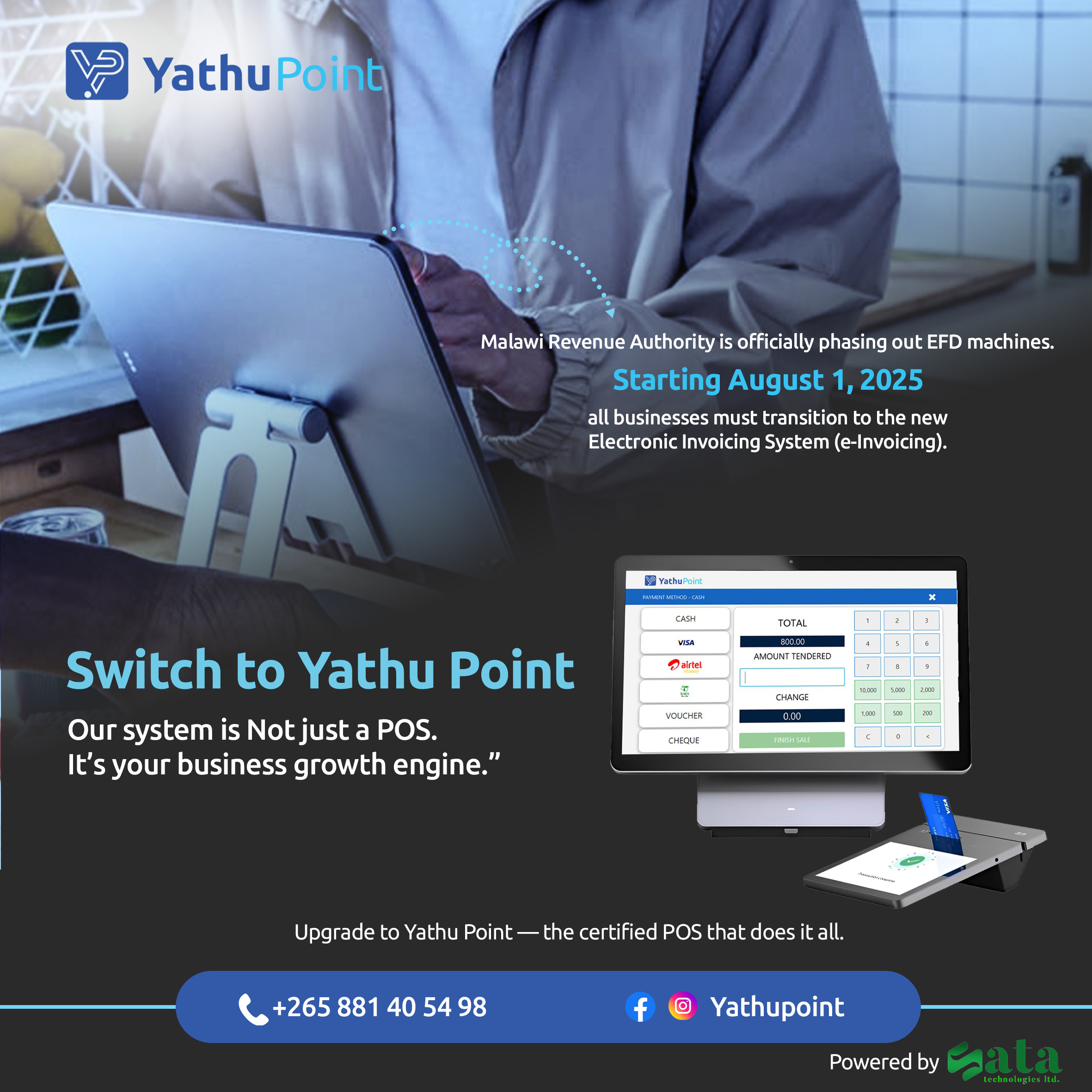 EFD is phased out. Yathu Point POS is the future.SATA Technologies delivers a fast, MRA-compliant POS system that makes sales, reporting, and tax compliance simple. SATA Technologies Limited provides a broad-spectrum of Information and Communication Technology (ICT) and related services to Malawi private, government and social business sectors as a whole.