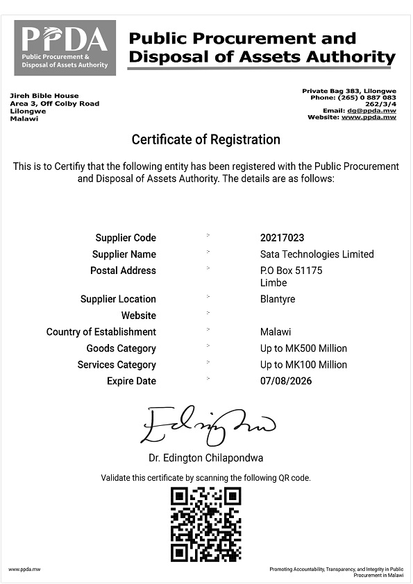 Sata Technologies is a fully registered and compliant technology company, committed to delivering reliable and trustworthy digital solutions. We proudly operate with a valid Certificate of Incorporation, confirming our legal registration, and an up-to-date Tax Clearance Certificate, demonstrating our commitment to transparency and statutory compliance. In addition, our PPDA Certification qualifies us to professionally engage in public and private sector procurement, assuring clients of our credibility, accountability, and adherence to national standards. With Sata Technologies, you partner with a company built on integrity, compliance, and proven professionalism.